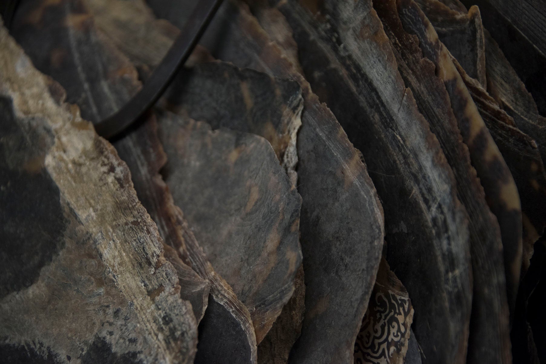 タイマイの甲羅は成長にともなって、紙1枚程の薄い層が瓦状に重なり、樹齢を重ねた年輪のように厚みを形成していきます。また、鼈甲は温めると自由に曲がり、水分と熱のみで圧着できるという特性を持っています。